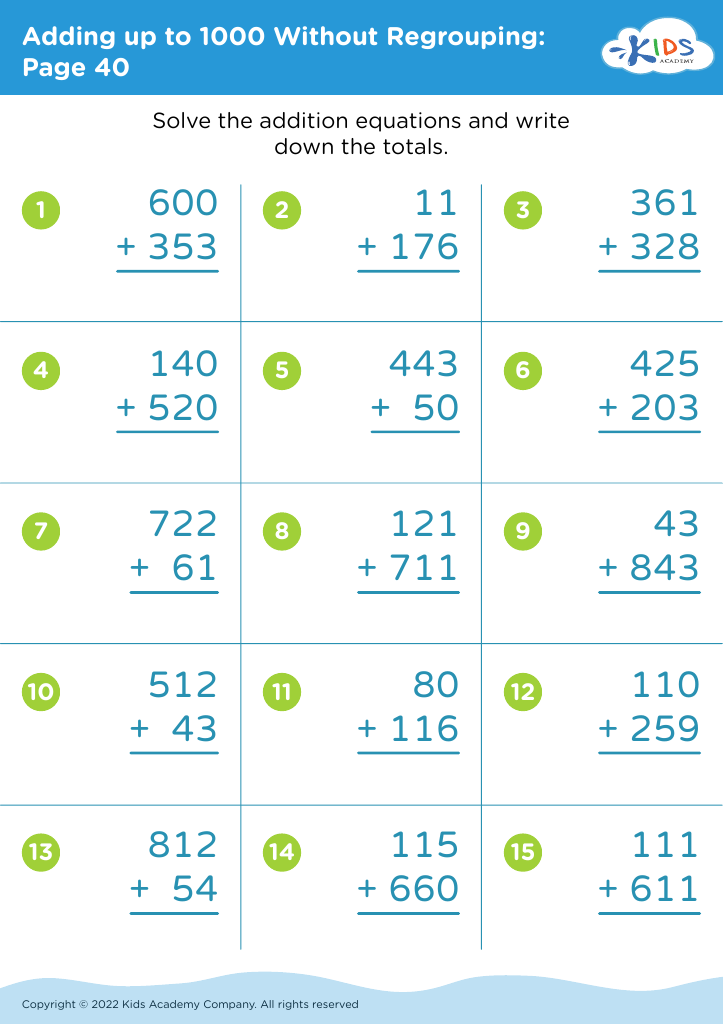 2. Reinforcement: By repeatedly solving addition problems, students reinforce the concepts and strategies they have learned in the classroom, leading to better retention and understanding of mathematical principles.