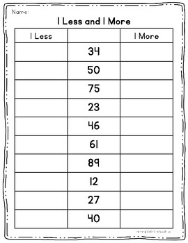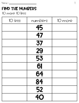 These worksheets typically feature a number at the center, and students are asked to write the number that is 10 less and 10 more than the given number. This helps reinforce the idea of how numbers are related to each other and provides practice in basic addition and subtraction skills.
