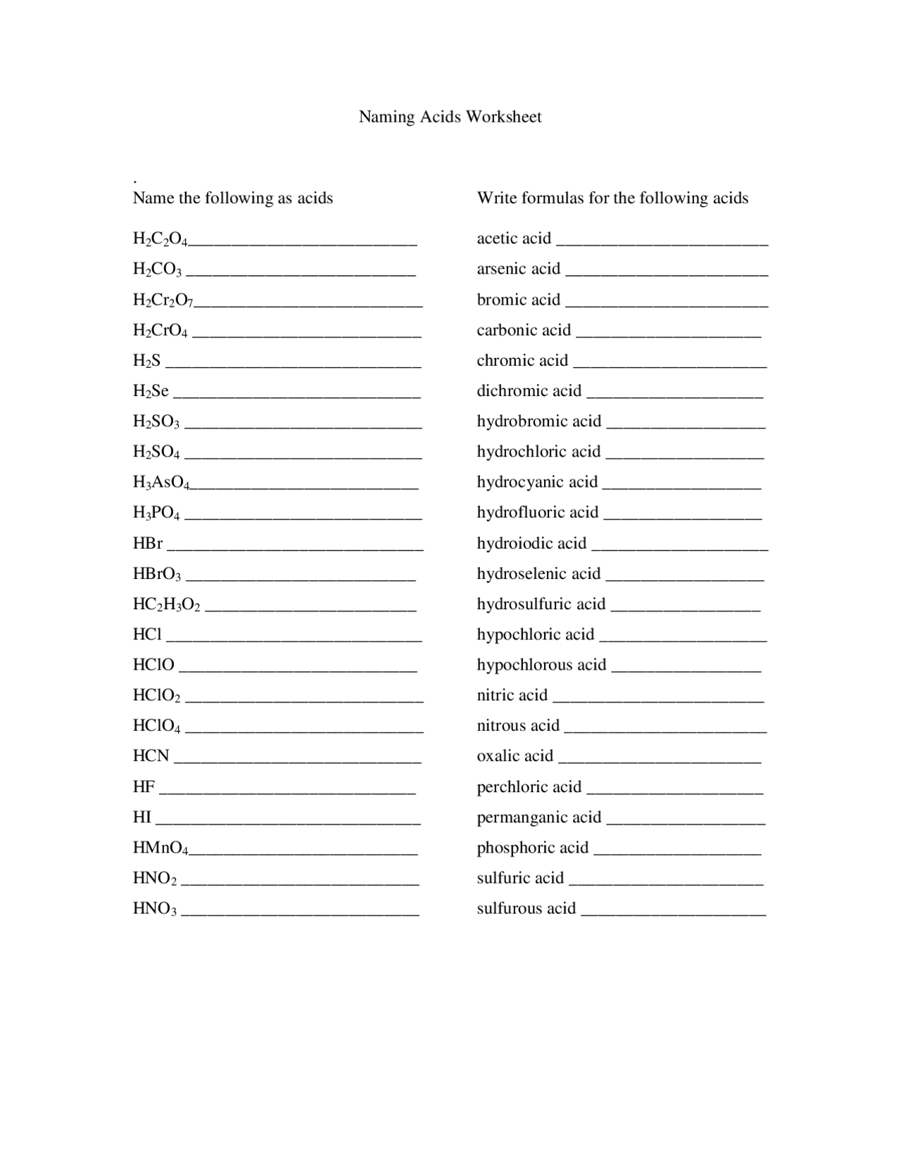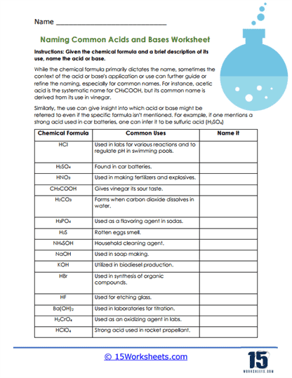 Practice with acid naming worksheets allows students to become familiar with the naming conventions for different types of acids. This repetition helps reinforce the rules and guidelines for naming acids, enabling students to more easily recognize and name acids in their coursework and assessments. Additionally, completing acid naming worksheets can improve students’ problem-solving skills and overall understanding of chemical nomenclature.