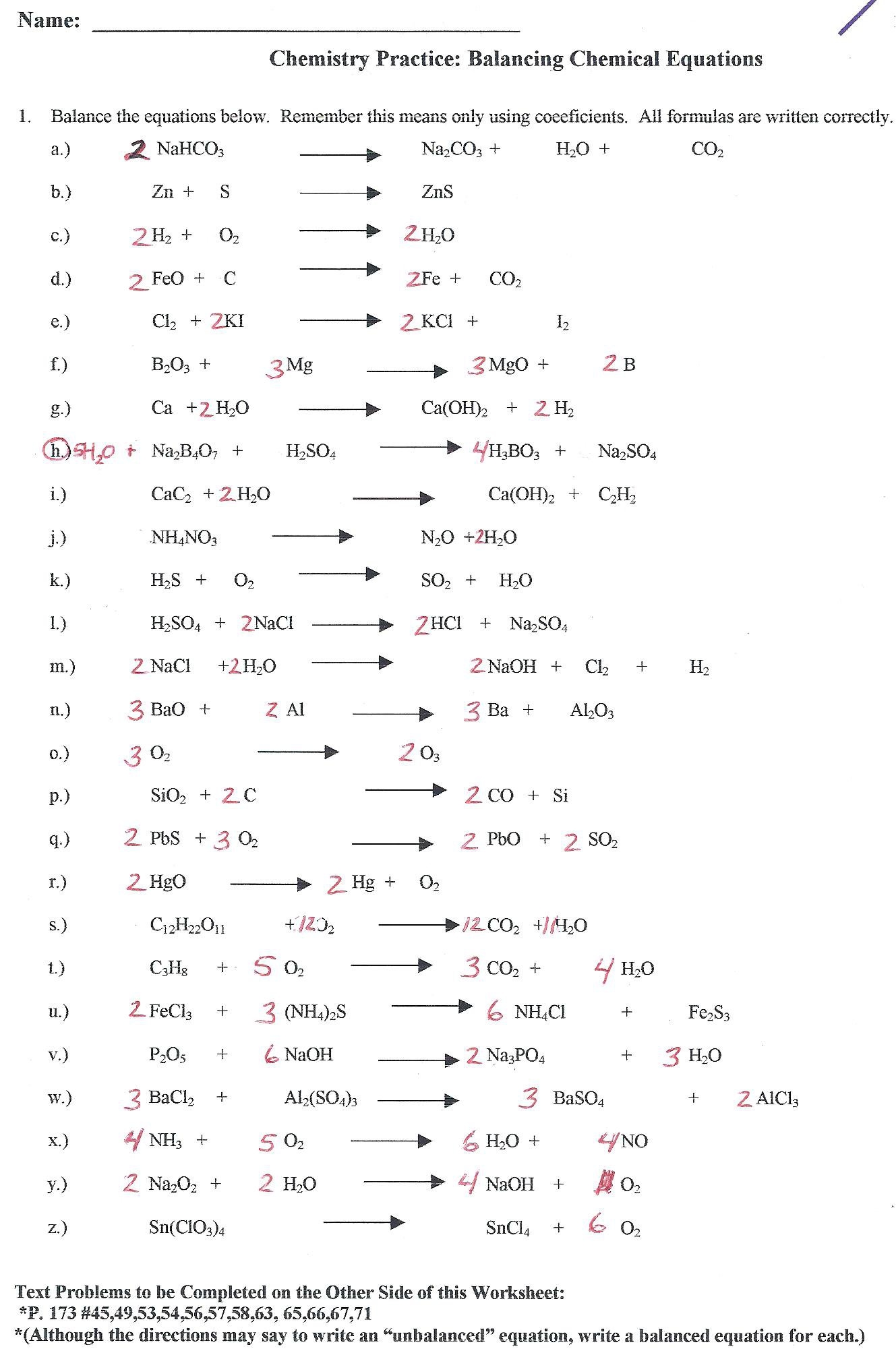Balance the chemical equation worksheet is a useful tool that provides students with practice in balancing equations. These worksheets typically contain a series of chemical equations that need to be balanced by adjusting the coefficients of the compounds. By working through these problems, students can improve their understanding of chemical reactions and develop their skills in balancing equations.