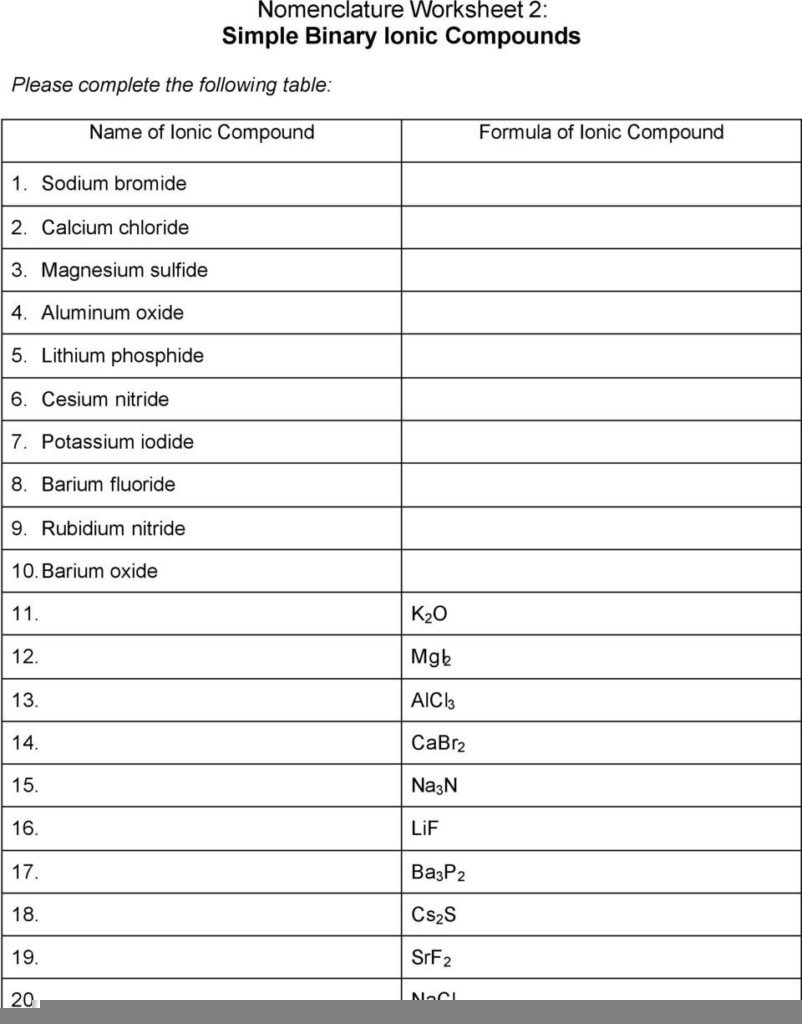 In addition to naming binary ionic compounds, students may also be asked to write the formulas for given compound names. This requires an understanding of how to balance the charges of the cation and anion in order to create a neutral compound. Practice with worksheets can help reinforce this skill and improve students’ proficiency in chemical nomenclature.