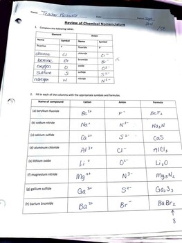 One common type of chemical bond is the ionic bond, which involves the transfer of electrons from one atom to another. In ionic bonding, positively charged ions (cations) are attracted to negatively charged ions (anions) to form a stable compound. Students may be asked to identify the ions involved in an ionic bond or write the chemical formula for a given ionic compound on a bonding worksheet.