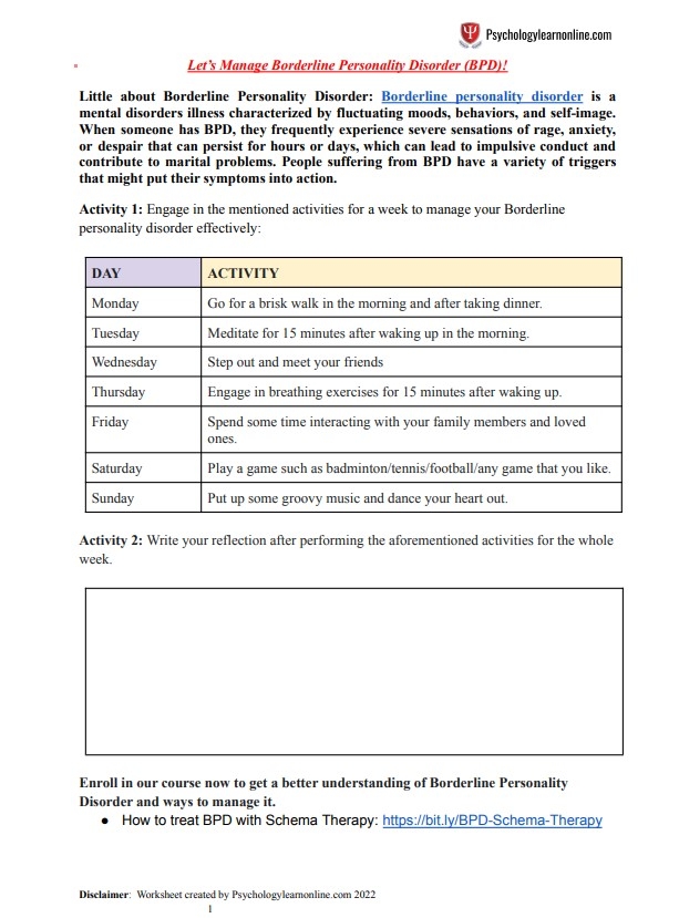 Borderline Personality Disorder (BPD) is a mental health condition that affects the way a person thinks and feels about themselves and others. It can be challenging to manage and often requires a combination of therapy and medication. One effective tool used in therapy for individuals with BPD is the use of worksheets. These worksheets are designed to help individuals better understand their thoughts, emotions, and behaviors, and to develop coping strategies to manage them.