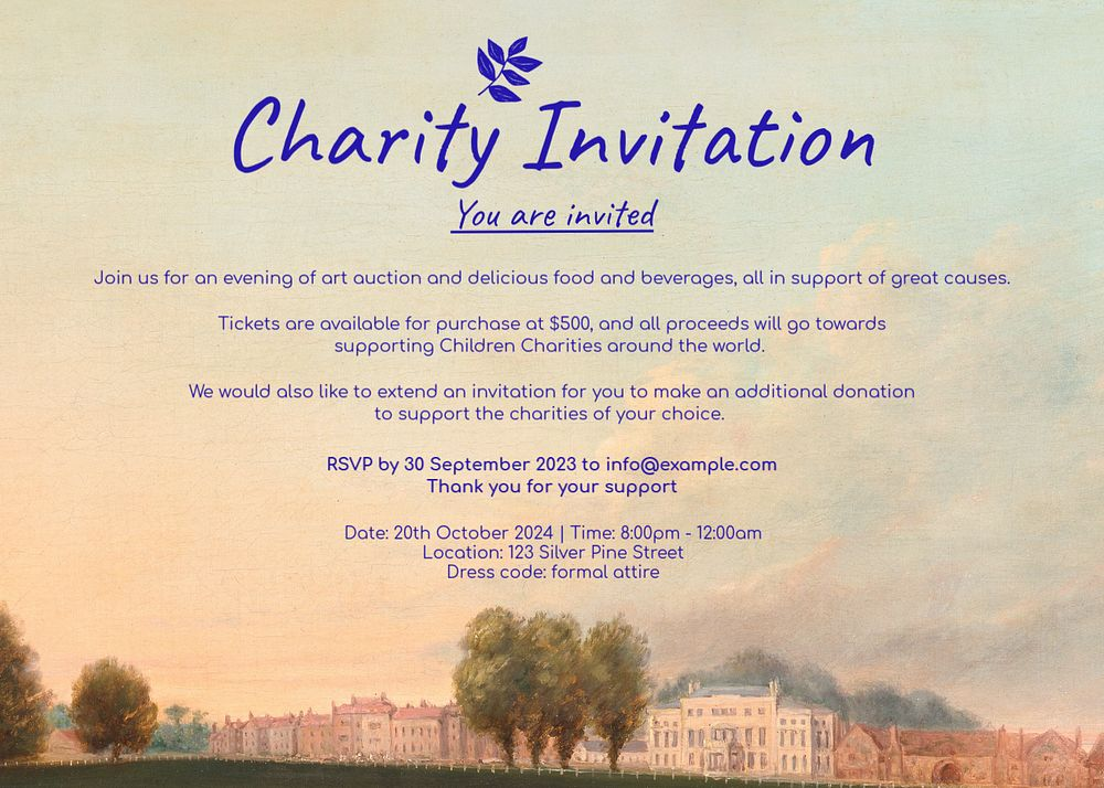 Make sure to include all the necessary information on your invitation, such as the purpose of the event, details about the cause you are supporting, and any special guests or speakers who will be attending. Be sure to also include clear instructions on how guests can RSVP and donate to your charity, whether it be through a website, email, or phone number.