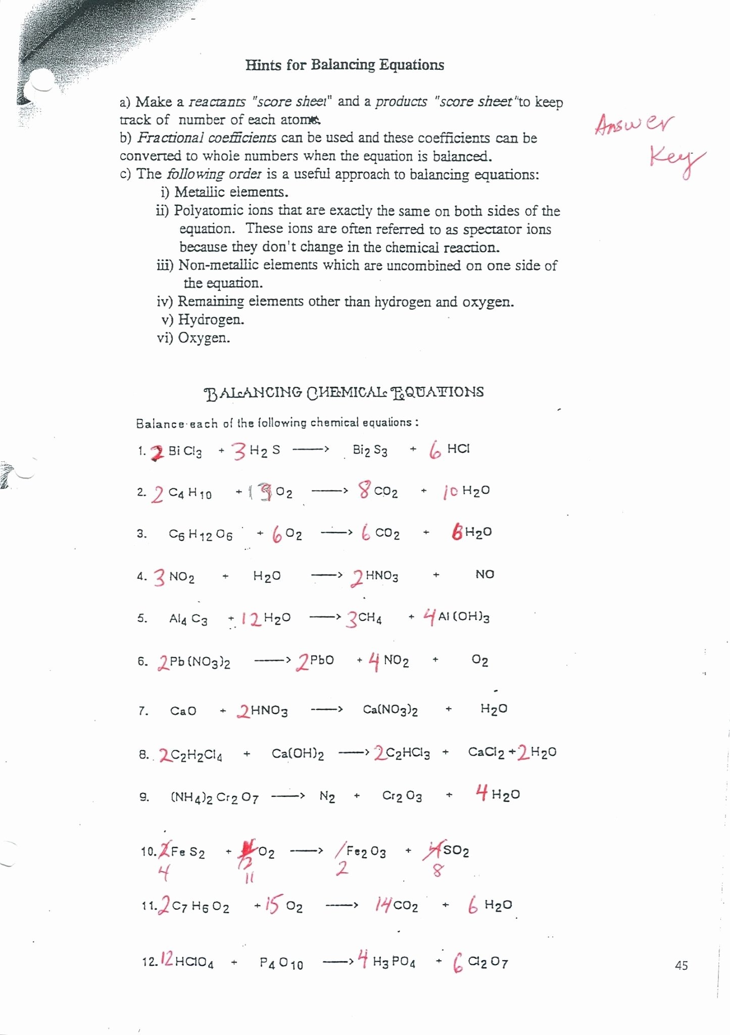 One common type of chemistry worksheet on balancing equations includes a series of unbalanced chemical equations that students must solve. The answer key for these worksheets provides the balanced equations, allowing students to check their work and correct any mistakes they may have made.