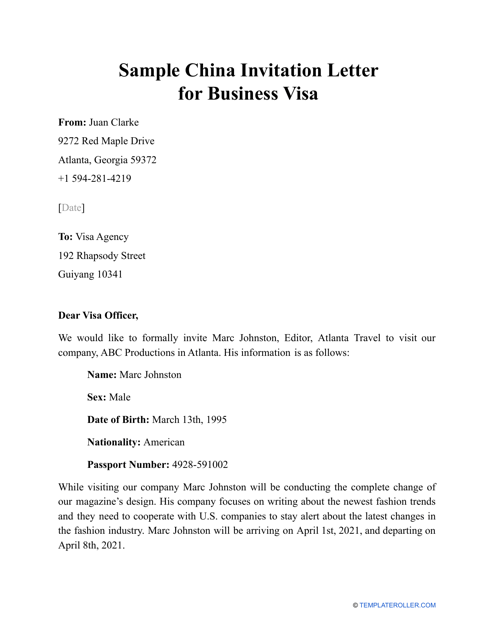 Using this template, you can customize the details to suit your specific requirements and ensure that your invitation letter meets the necessary criteria for a China business visa application.