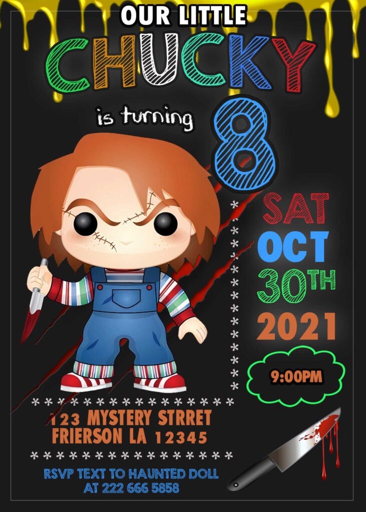 Whether you’re hosting a small gathering or a big bash, our Chucky birthday invitation template is sure to impress your guests and set the stage for a fantastic party. So why wait? Download the template today and start planning the ultimate Chucky-themed birthday celebration for your child.