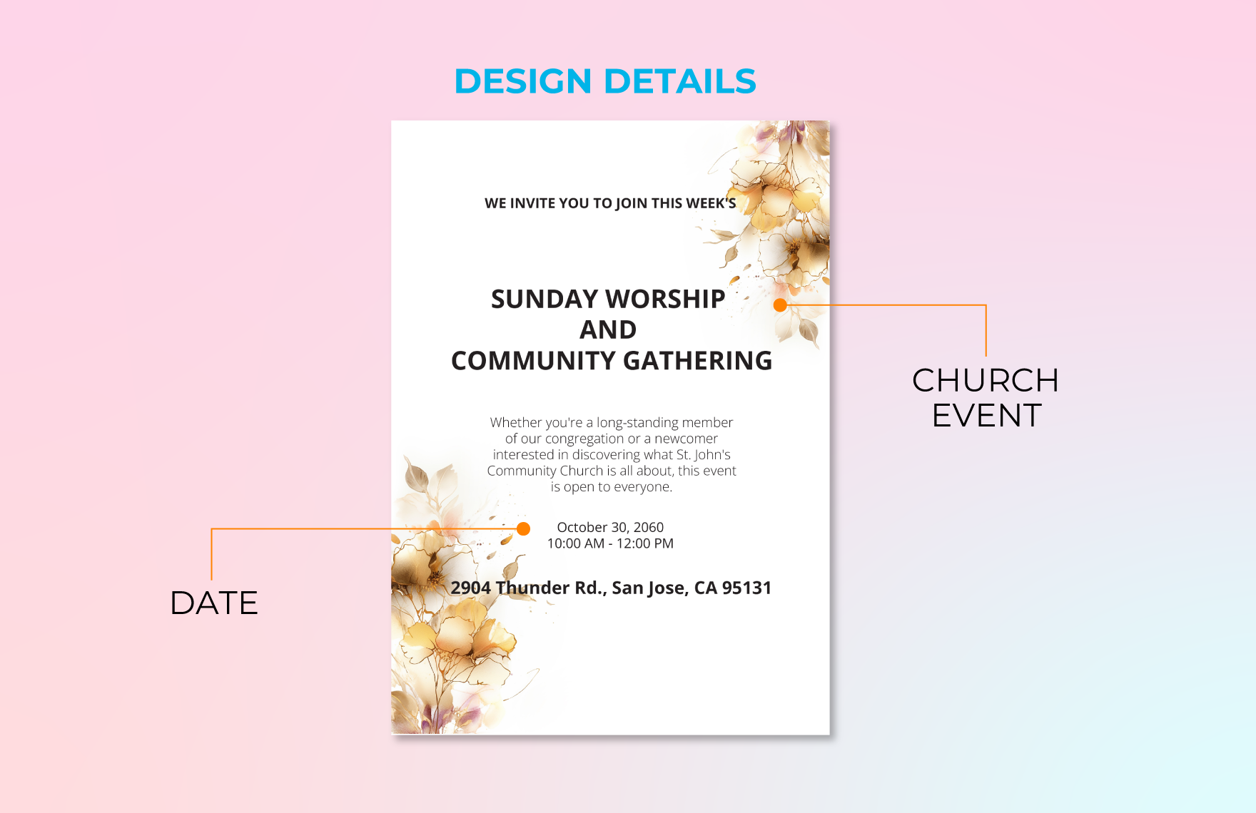 Our church service invitation template includes all the essential information your guests need to know, such as the date, time, location, and theme of the service. You can personalize the template with your church’s logo, colors, and any additional details you want to include. Whether you’re hosting a special event, guest speaker, or holiday service, our template can be easily customized to suit your needs.