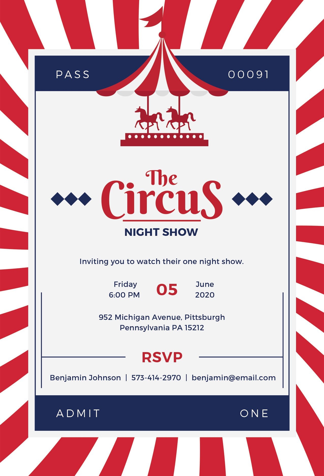 Our circus invitation template features a whimsical design that captures the magic and excitement of the big top. With bold stripes, bright colors, and images of circus performers, it will instantly grab the attention of your guests and get them excited for the show.
