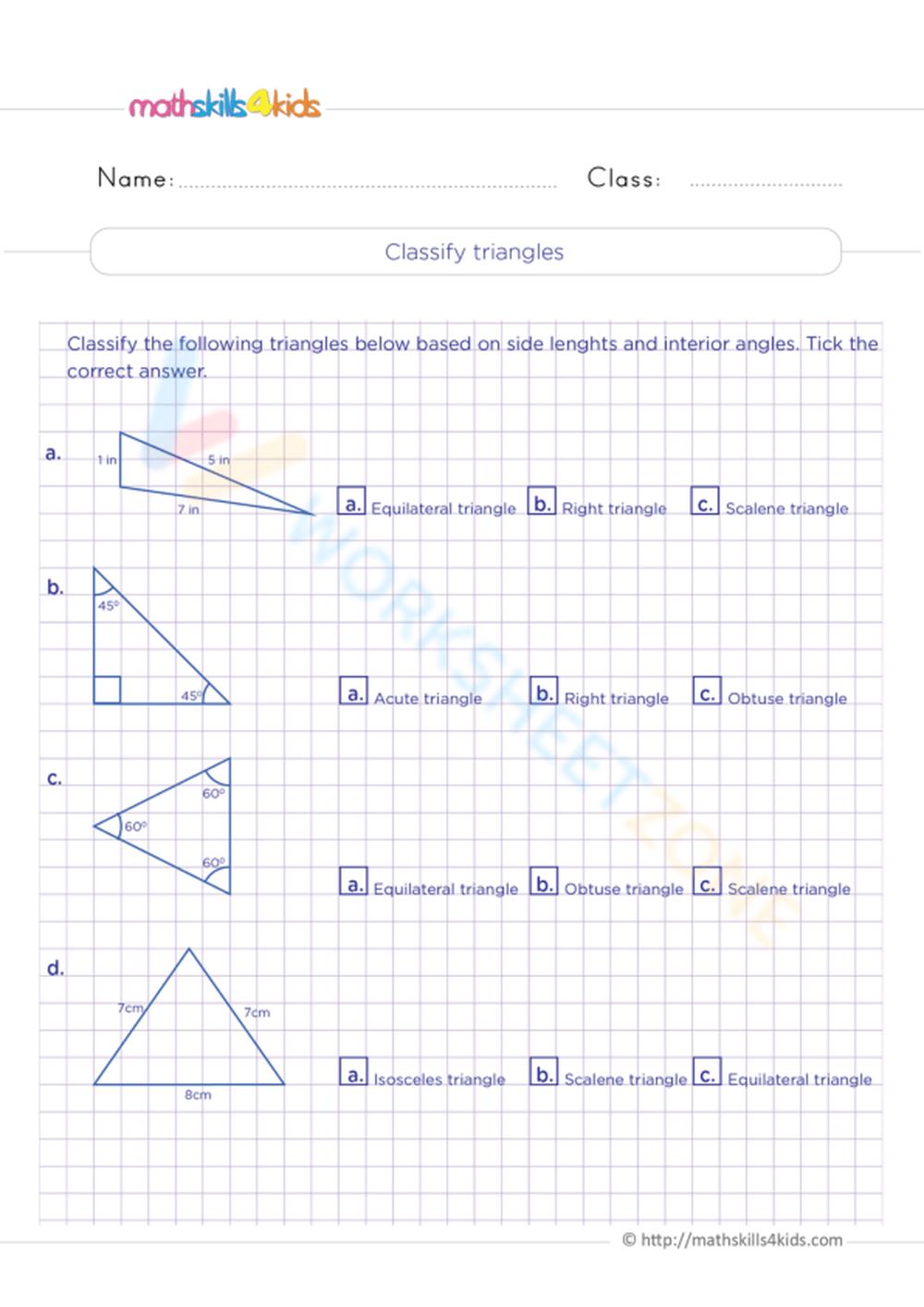 A classify triangles worksheet typically includes a variety of triangles with different side lengths and angle measurements. Students are tasked with determining whether each triangle is equilateral, isosceles, scalene, acute, obtuse, or right-angled. By working through these worksheets, students can sharpen their geometry skills and reinforce their understanding of triangle properties.