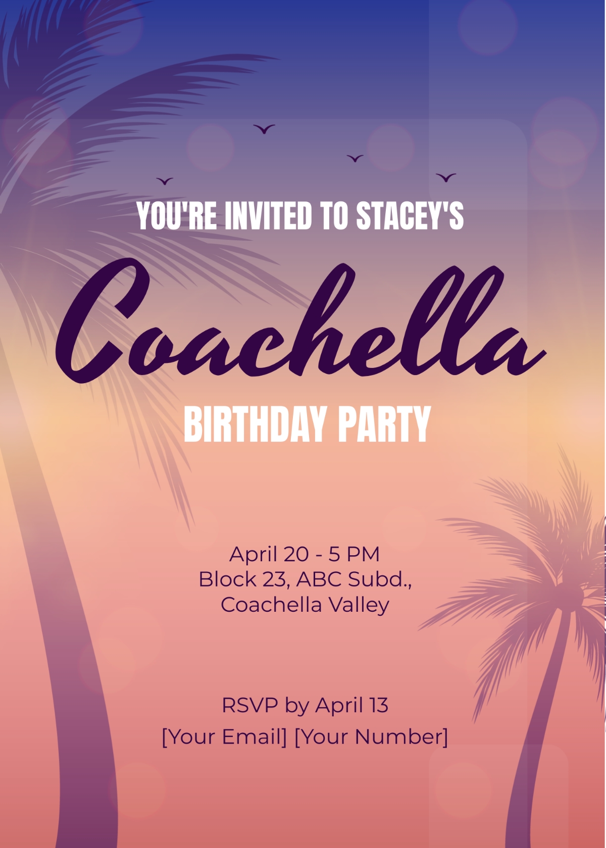 With this template, your guests will be excited to attend your Coachella themed party and will know exactly what to expect. Make sure to personalize the invitation with your own details and style to make it unique to your event.