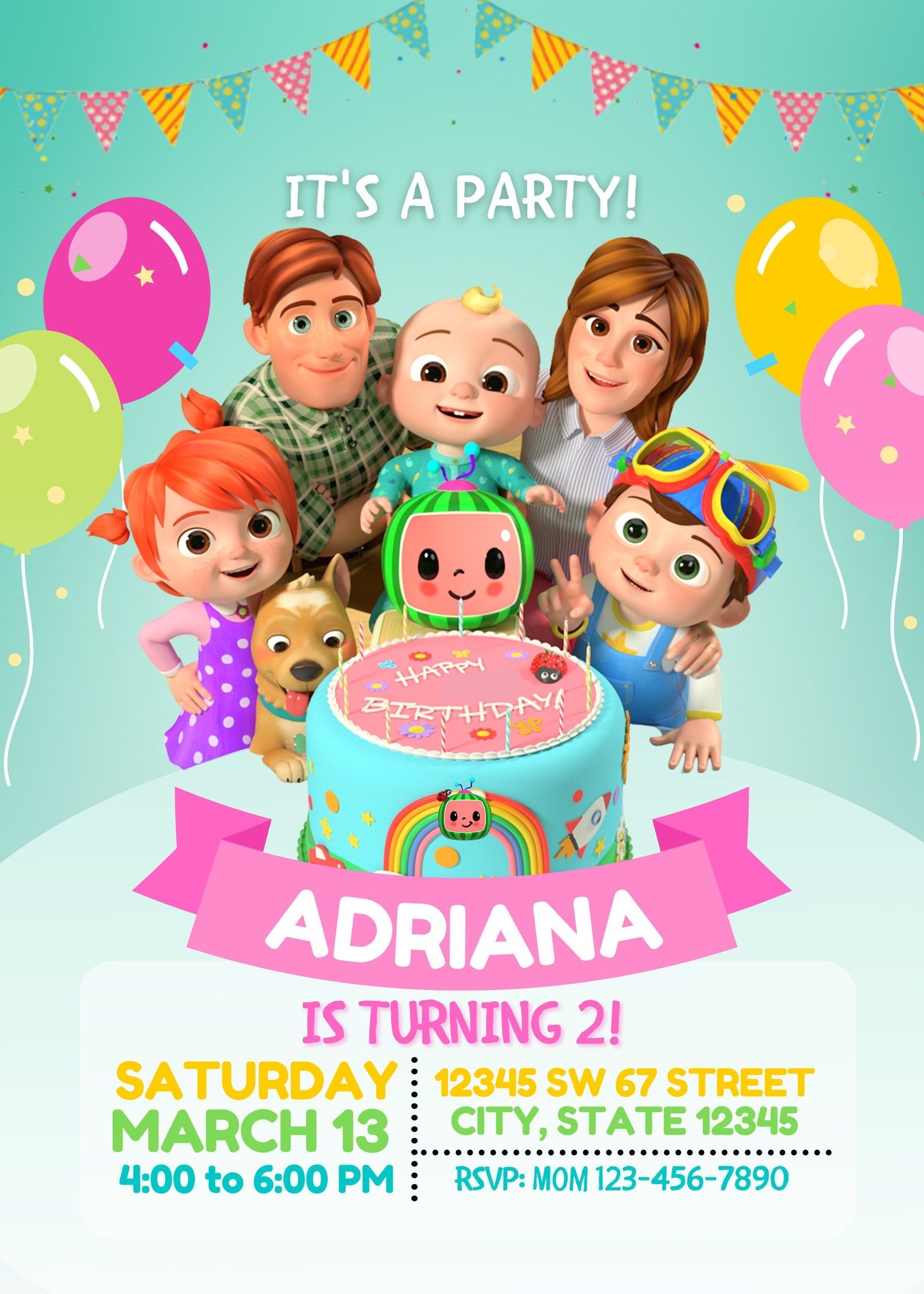 Our Cocomelon party invitation template features all the beloved characters from the show, including JJ, his siblings, and his animal friends. The template is colorful and engaging, making it perfect for a young audience. You can personalize the invitation with your child’s name, party details, and RSVP information to make it truly special and unique. Whether you’re hosting a birthday party, playdate, or just a fun get-together, this template is sure to impress your guests.