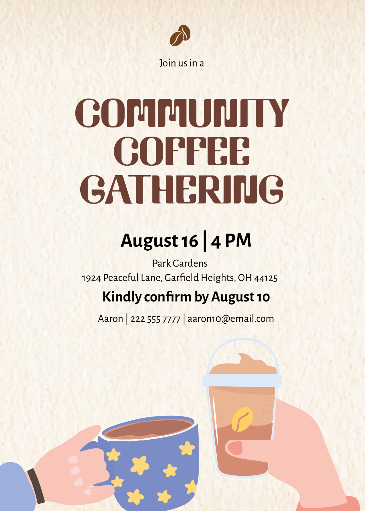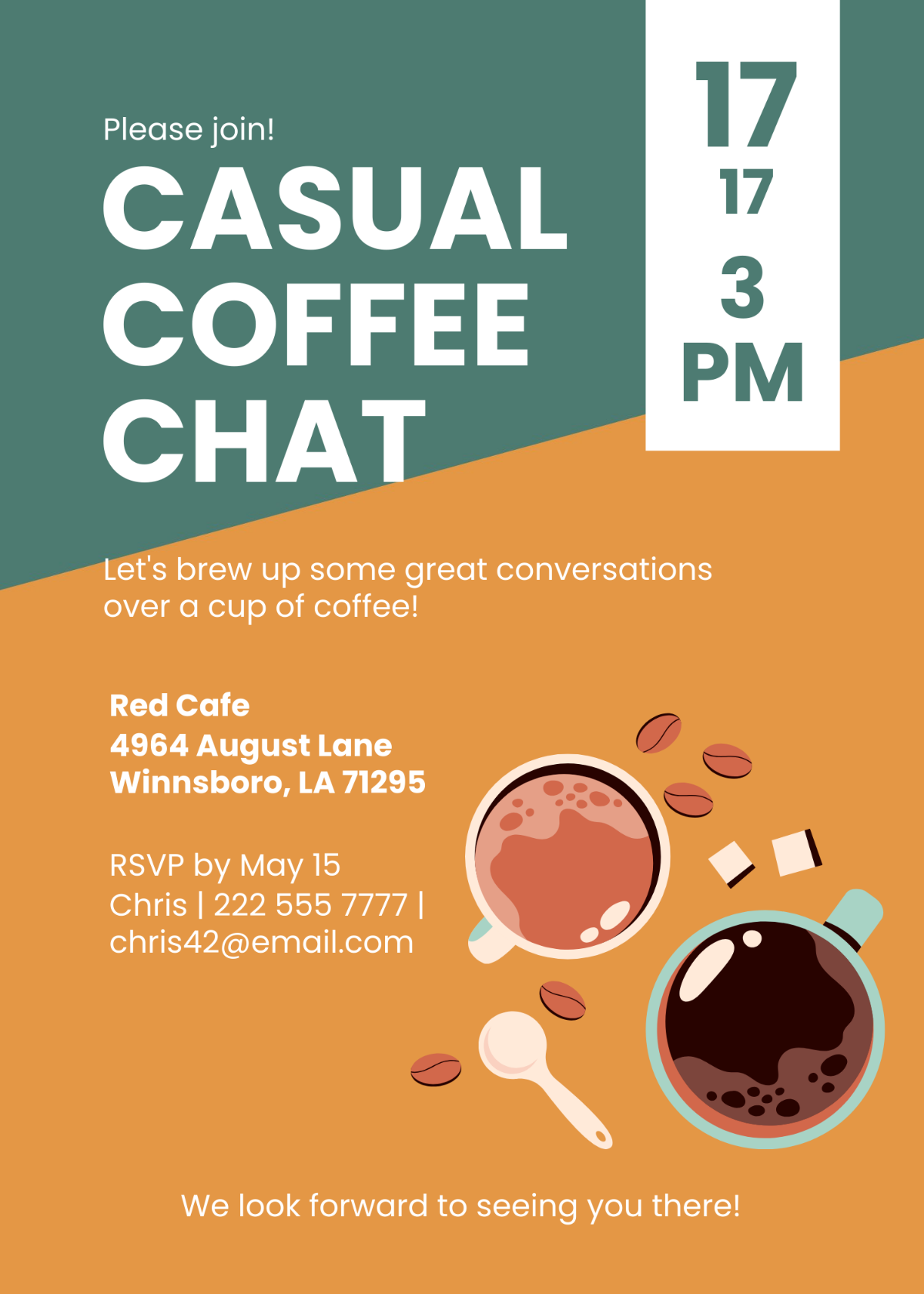 Whether you are meeting with friends, colleagues, or new acquaintances, our coffee chat invitation template is a versatile and effective way to extend a warm invitation for a casual coffee gathering. So go ahead and use this template to plan your next coffee chat and make meaningful connections over a delicious cup of coffee!