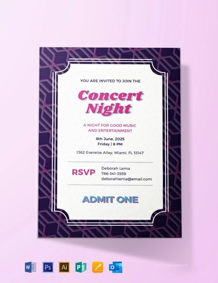 Don’t miss out on this opportunity to elevate your event invitations with our concert ticket invitations template free. Download your favorite design now and get ready to rock the stage with an unforgettable event experience!