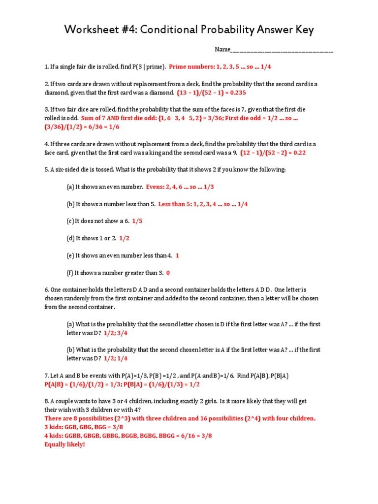 One way to practice and enhance your understanding of conditional probability is through worksheets. These worksheets typically contain a series of questions and scenarios where you have to calculate the probability of an event happening given certain conditions. By solving these problems, you can improve your skills in applying conditional probability concepts and enhance your overall understanding of the topic.