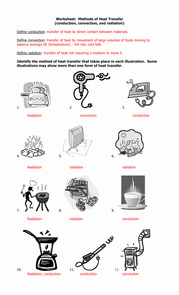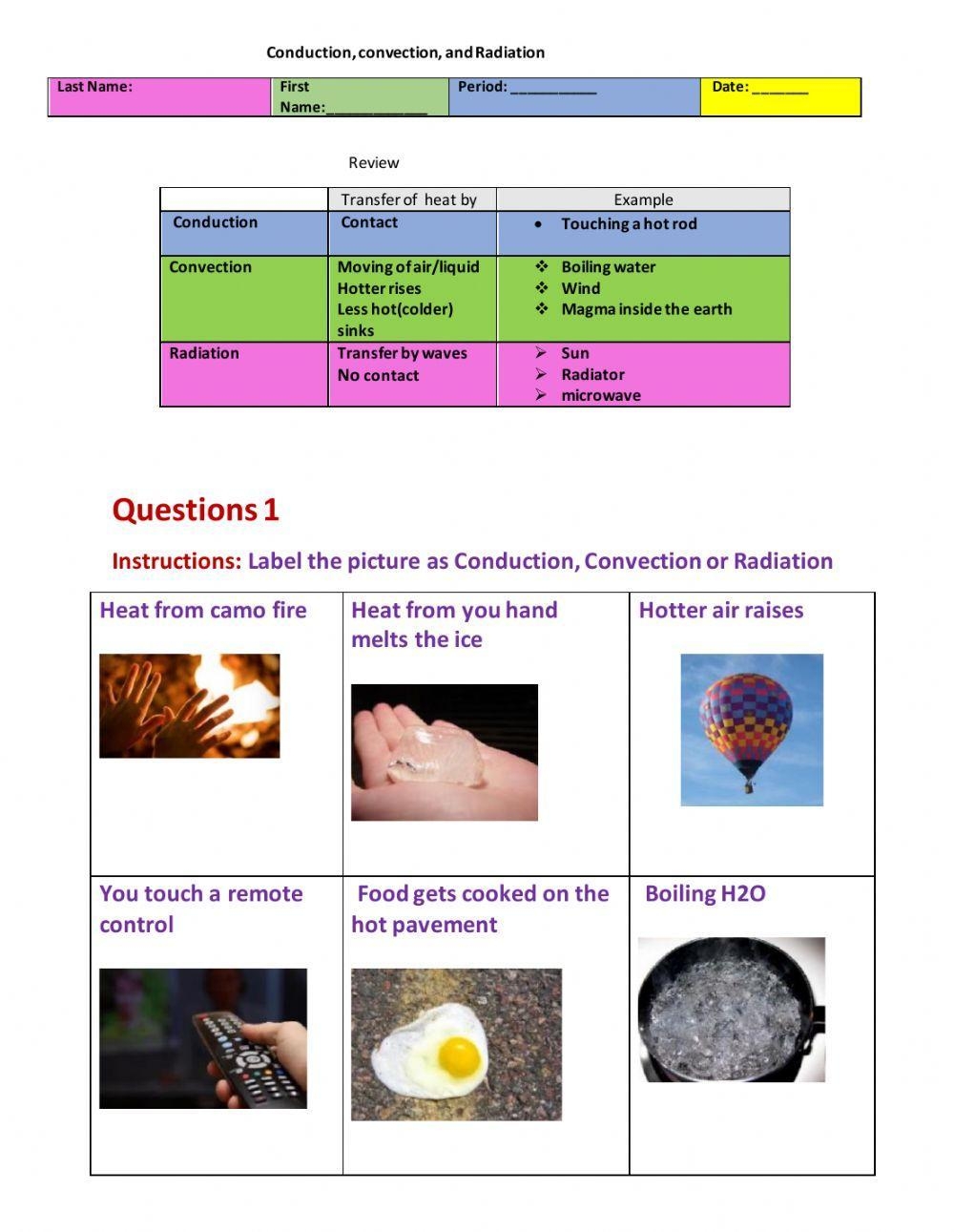 By completing a conduction, convection, and radiation worksheet, students can not only test their knowledge of these concepts but also apply them to real-world situations. This hands-on approach to learning can help reinforce their understanding of heat transfer and how it impacts our daily lives. Overall, a worksheet on conduction, convection, and radiation can be a valuable tool for students to enhance their understanding of these fundamental concepts in physics.