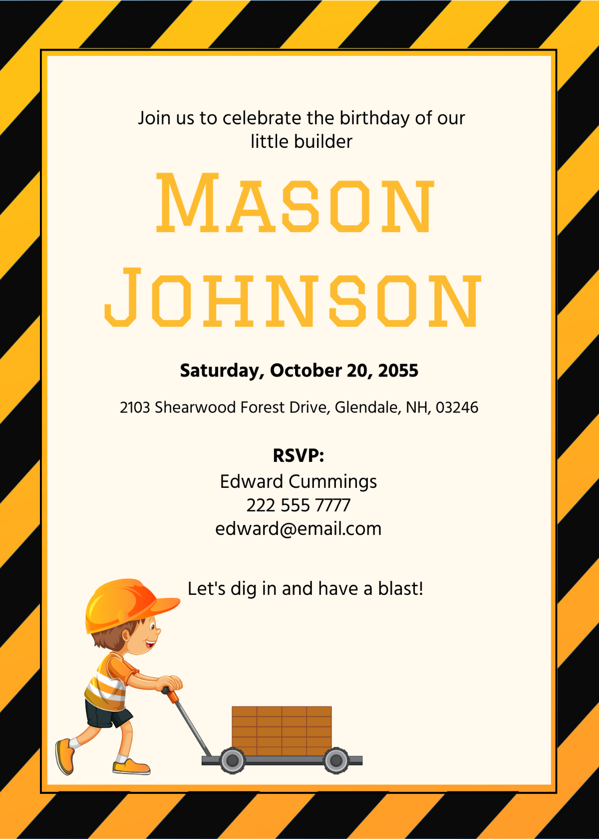 When choosing a construction party invitation template, look for designs that feature construction vehicles, tools, and bright yellow and black colors. You can add in your party details such as the date, time, location, and RSVP information to make sure your guests have all the necessary information. Some templates even allow you to include a cute construction-themed pun or phrase to add a touch of personality to your invitations.