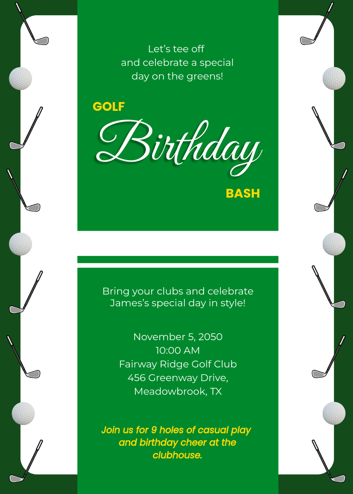 Consider including a brief overview of the event schedule, including any pre-golf activities, tee times, and post-golf networking opportunities. You can also add a call-to-action to encourage recipients to RSVP and secure their spot at the event.