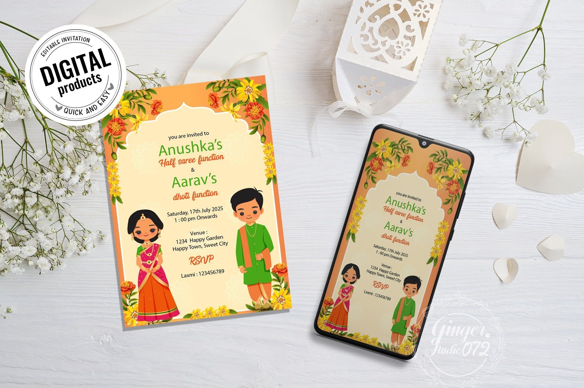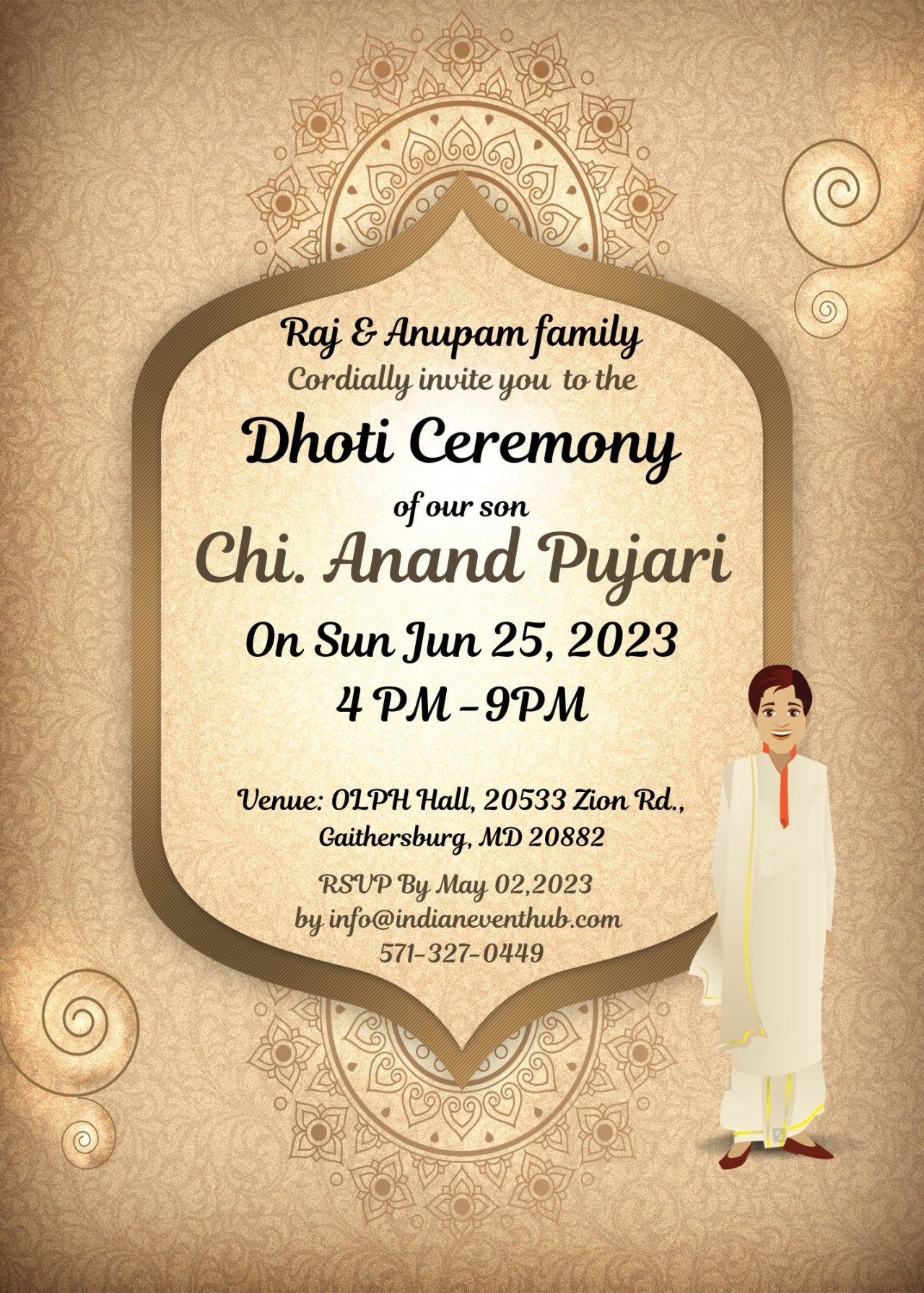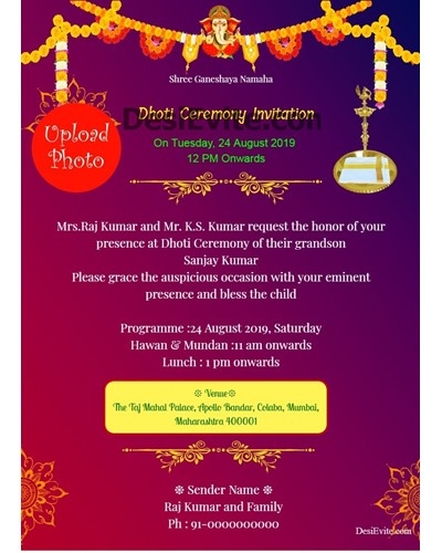 Celebrate in style and make your dhoti function one to remember with our invitation template. Customize it to your liking, send it out to your guests, and get ready for an unforgettable event filled with joy and laughter. Let the festivities begin!