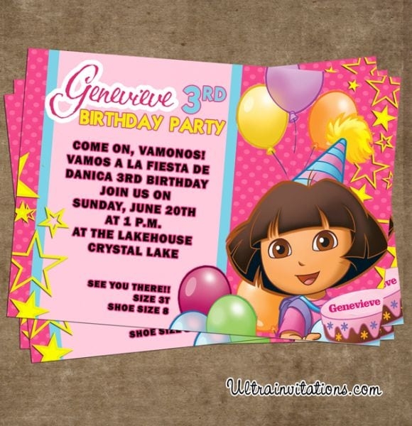5. Dora Jungle Safari Invitation: Take your guests on a wild adventure with this jungle safari-themed invitation. With exotic animals, lush greenery, and Dora leading the way, this template will transport your guests to a tropical paradise. It’s a fun and adventurous way to invite your guests to the party.