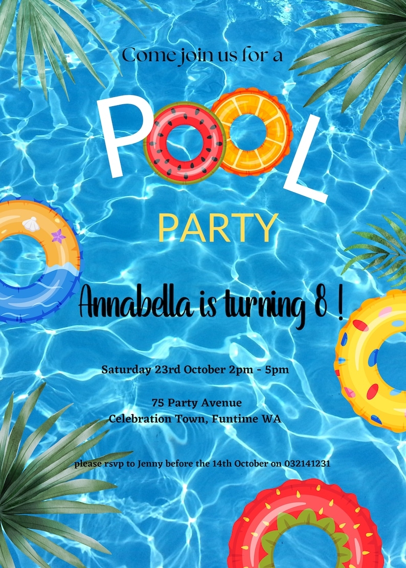 Don’t settle for boring, generic invitations for your pool party. With our editable pool party invitation template, you can create a custom invitation that will make a splash with your guests and set the stage for a memorable event. So dive right in and start designing your perfect pool party invitation today!