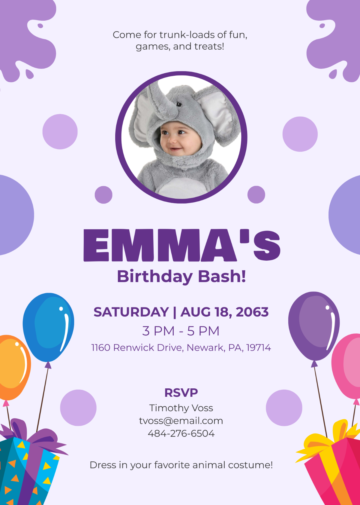 So why settle for a plain and boring invitation when you can make a statement with our elephant birthday invitation template? Start planning your party today and get ready to celebrate in style with this charming and unique design.