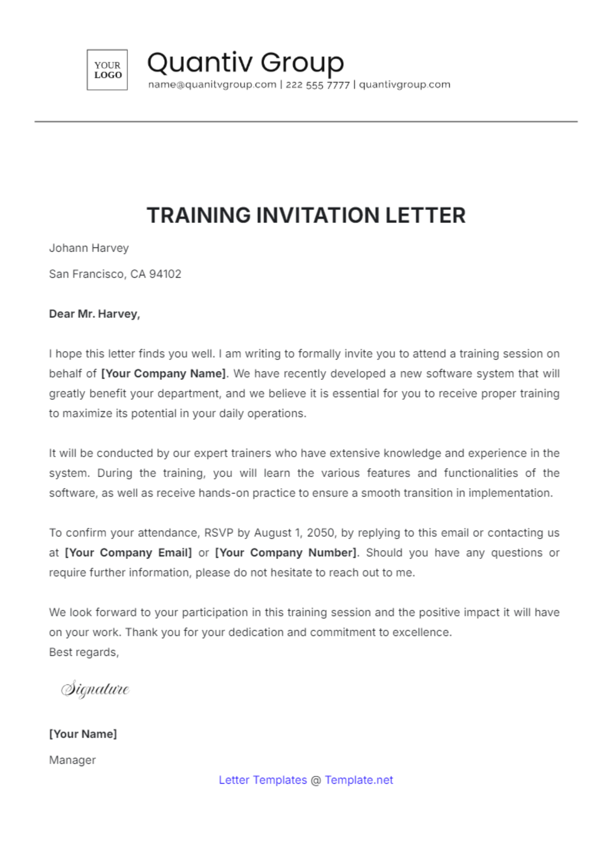We are thrilled to invite you to attend our upcoming training session on [Topic]. This program is designed to provide you with valuable insights and skills that will benefit you in your personal and professional development.