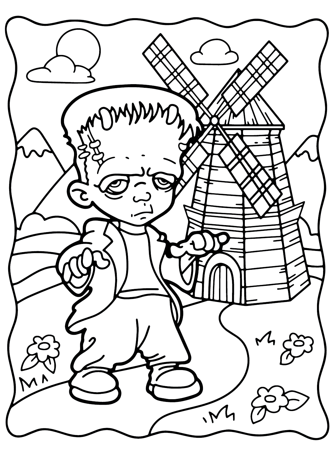 On the Frankenstein coloring page, you’ll find a detailed outline of the iconic monster. From his bolts in his neck to his stitched-together body, every aspect of Frankenstein is ready for you to color. You can choose traditional green and black colors, or get creative with your own unique color scheme!