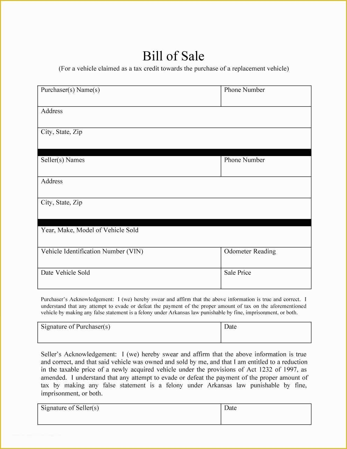 Free Printable Bill of Sale Template for Car