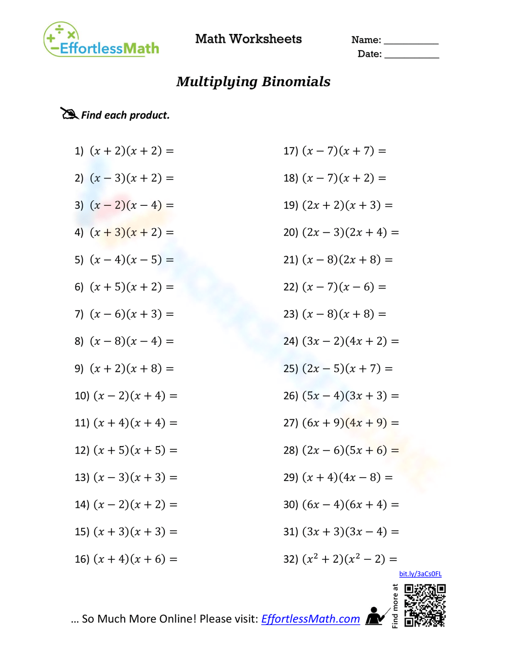 By providing exercises that require students to multiply binomials, these worksheets help reinforce the concepts taught in class. They offer a structured way for students to practice and improve their understanding of the topic. With consistent practice, students can become more proficient in performing these operations confidently and accurately.