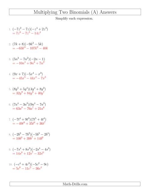 One of the advantages of using a multiplication of binomials worksheet is that it offers a range of problems at varying levels of difficulty. This allows students to start with simple problems and gradually progress to more complex ones as they gain confidence and proficiency. The worksheet provides a structured approach to learning, making it easier for students to track their progress and identify areas that need improvement.