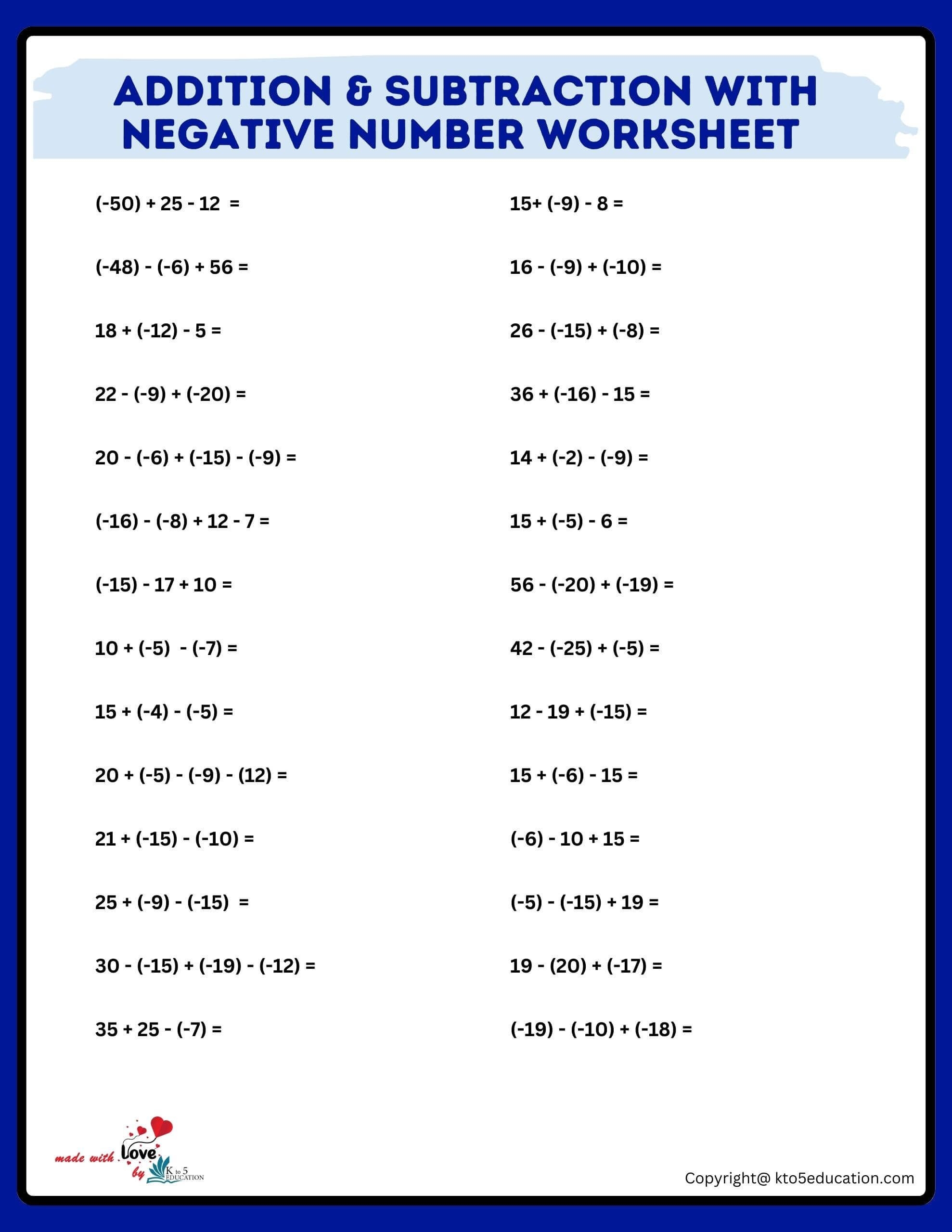 One of the key benefits of using negative numbers addition and subtraction worksheets is that they offer a range of problems that gradually increase in complexity. These worksheets typically start with simple addition and subtraction problems involving negative numbers and progress to more challenging exercises that require students to apply multiple operations.