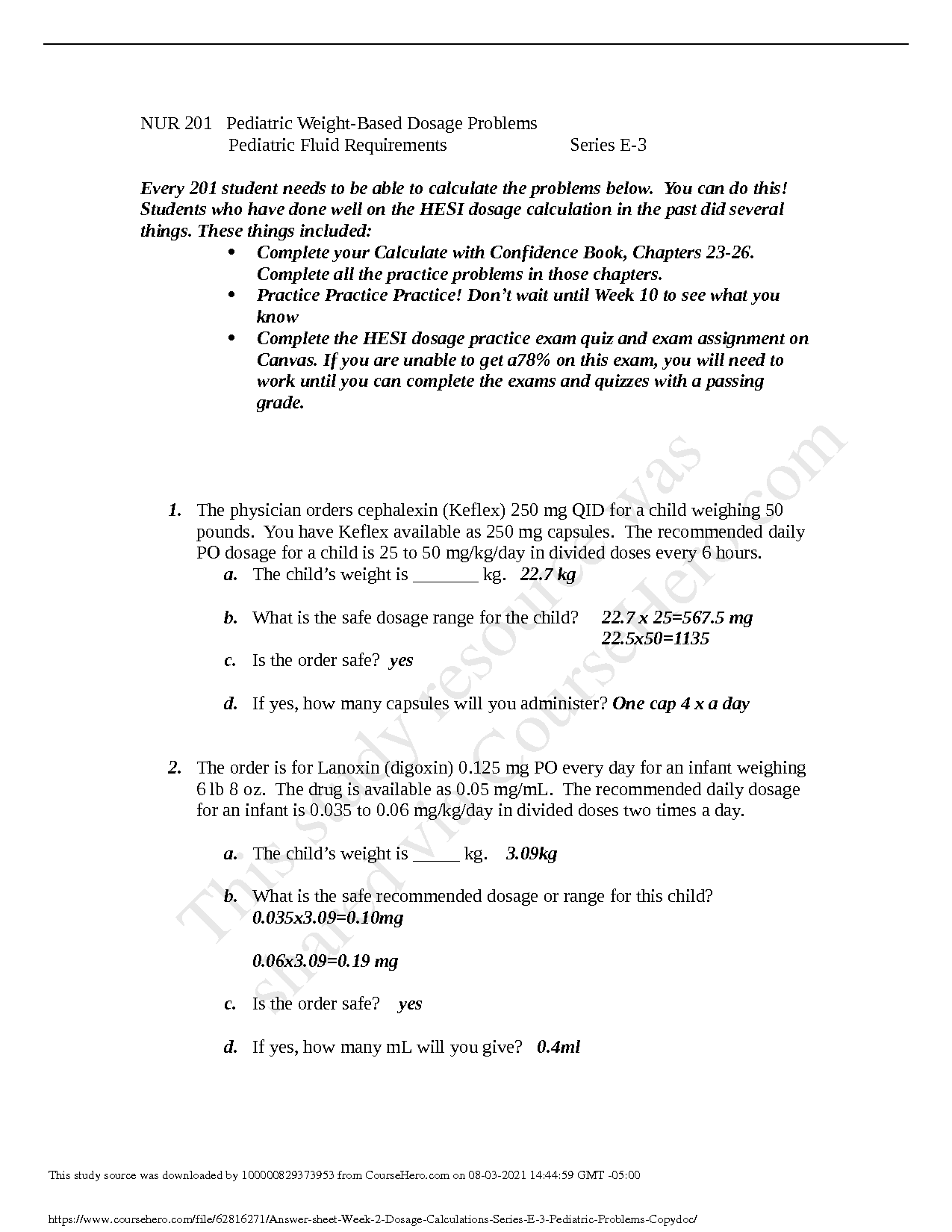 Nursing Dosage Calculation Practice Worksheets with Answers PDF