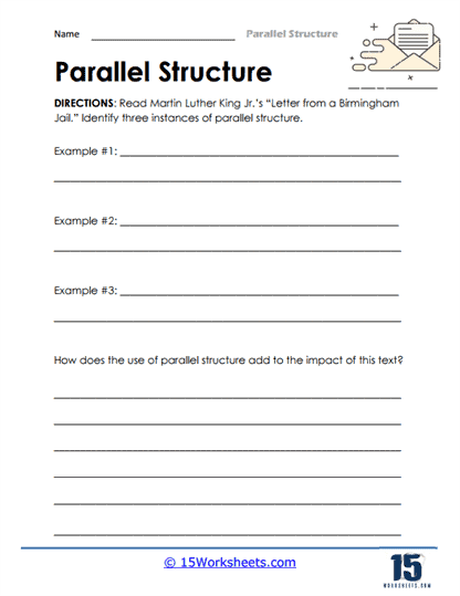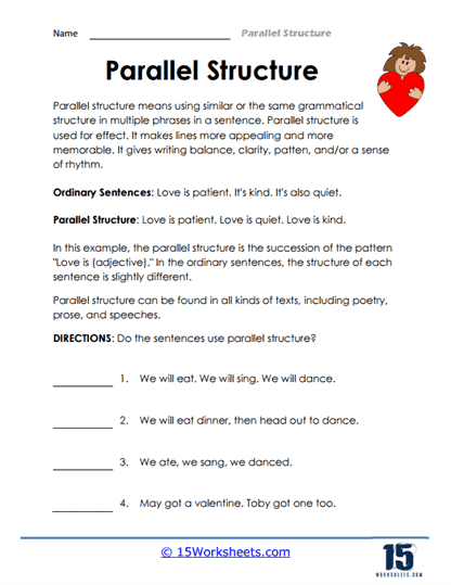 By completing this worksheet, students can gain a better understanding of how to use parallel structure in their writing. This practice will help them communicate their ideas more effectively and improve the overall quality of their writing.