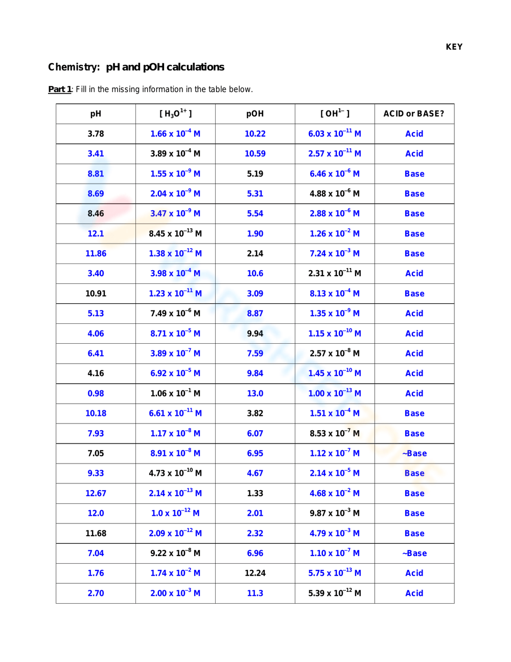 pH and pOH Calculations Worksheet