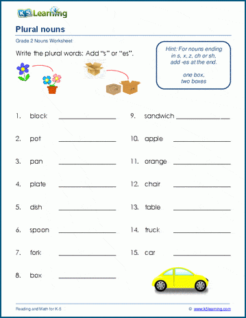 One common type of plural noun worksheet is the one where students are given a singular noun and are asked to write the plural form. This activity helps students understand the rules for changing singular nouns into plural nouns, such as adding -s to most nouns, adding -es to nouns ending in -ch, -sh, -x, -s, or -z, and changing -y to -ies for nouns ending in consonant + y.