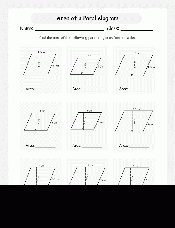 A printable area of a parallelogram worksheet typically includes a series of problems for students to solve. These problems may vary in difficulty and complexity, allowing students to practice their skills at different levels. The worksheet may include problems that require students to find the area of a parallelogram given the base and height, as well as problems that require them to find the missing base or height when the area is given.