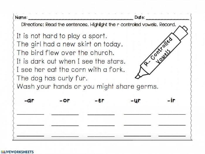 5. Sorting worksheets: Students can practice categorizing words based on their r-controlled vowel sound.