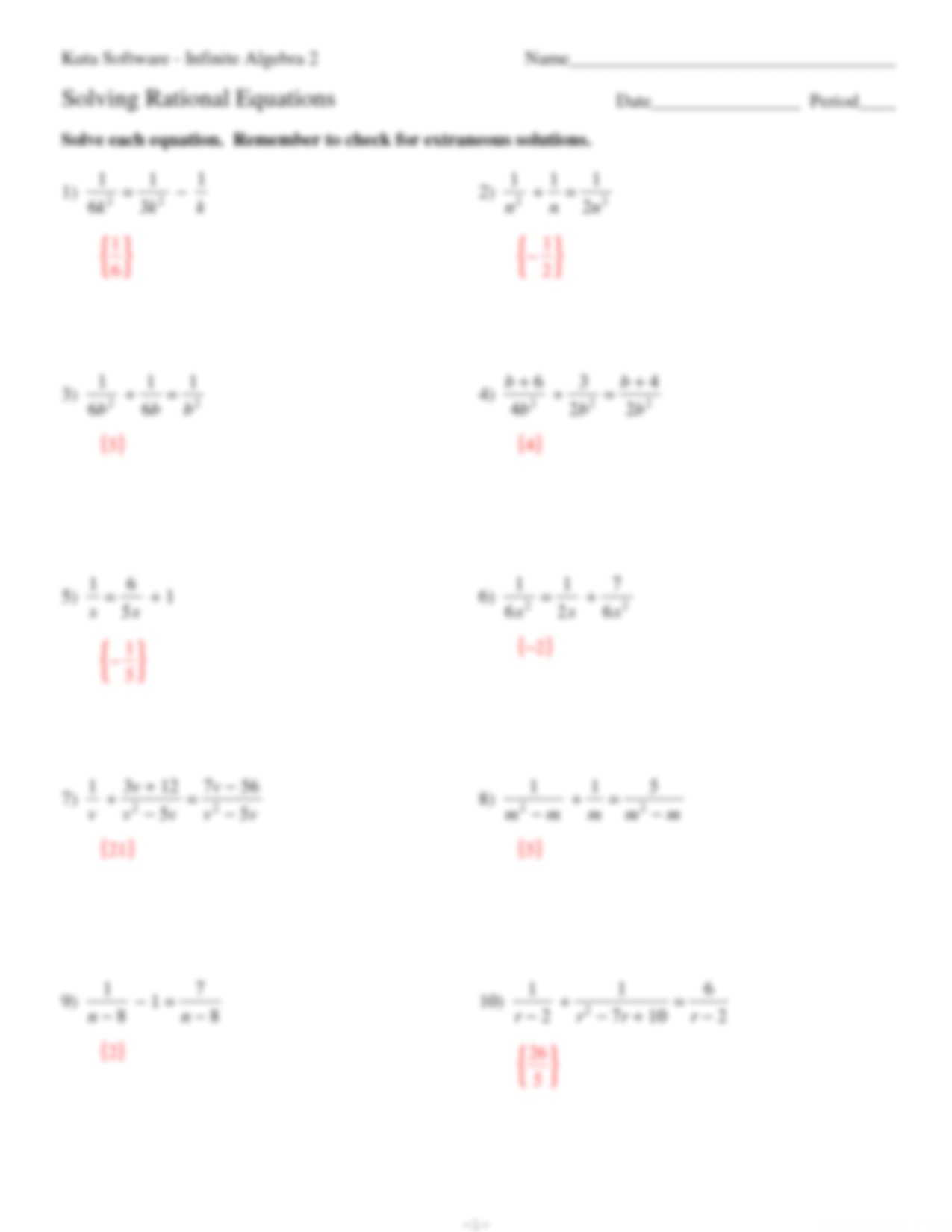 These worksheets typically contain a variety of rational equations of varying difficulty levels. Students are required to simplify the equations, solve for the variable, and check their solutions. By practicing on these worksheets, students can improve their understanding of rational equations and develop their problem-solving skills.