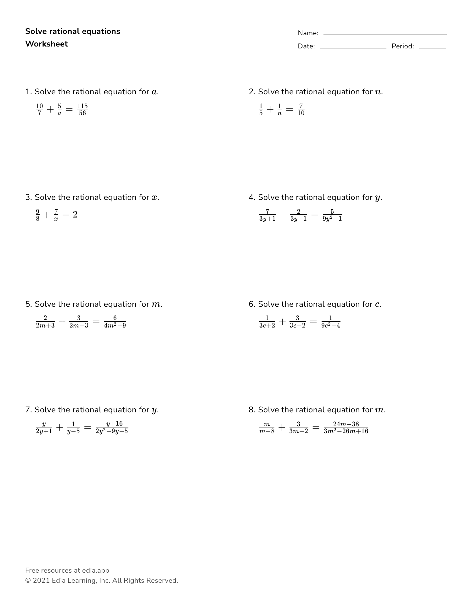 Rational equations can be challenging for students to master, as they involve fractions and variables in the equation. A rational equation is an equation that contains at least one fraction with a variable in the numerator, denominator, or both. To help students practice solving rational equations, teachers often provide them with worksheets to work on independently or in groups.