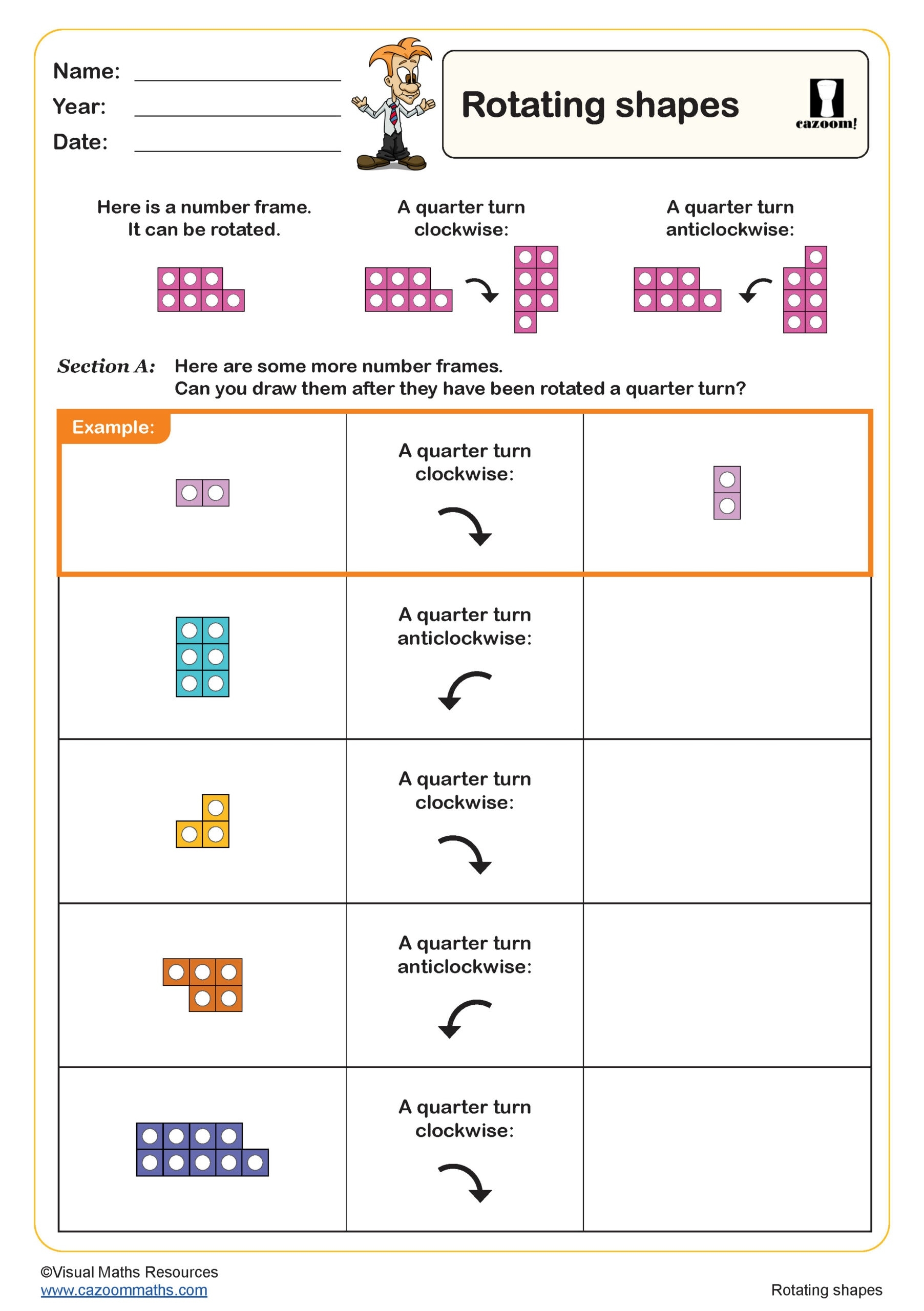 By using rotation worksheets, students can apply the principles of geometry in a hands-on and interactive way. They can visualize the rotation of shapes and objects, understand the concept of angles of rotation, and learn how to determine the direction of rotation. These worksheets also help students to identify rotational symmetry in various figures and patterns.