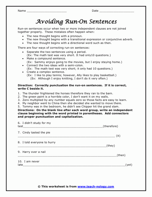 Run on sentences can be a common issue for many writers, as they can make writing confusing and difficult to read. By understanding what run on sentences are and how to fix them, you can improve the clarity and effectiveness of your writing. One helpful tool for practicing identifying and correcting run on sentences is a worksheet specifically designed for this purpose.