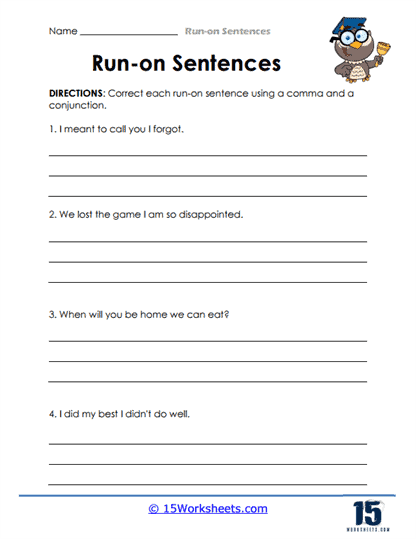 A run on sentences worksheet is a helpful resource for practicing identifying and correcting run on sentences. These worksheets typically provide examples of run on sentences and ask the reader to identify where the sentence should be divided or punctuated. They may also include exercises for creating new sentences that correctly combine independent clauses.