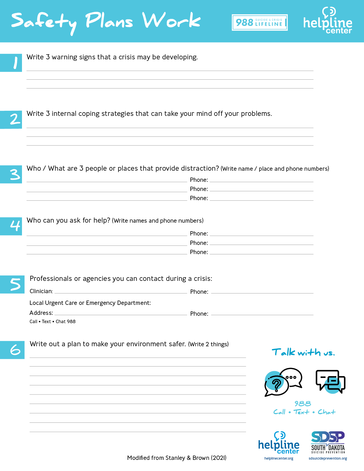 Here are some key components that are typically included in a safety planning worksheet: