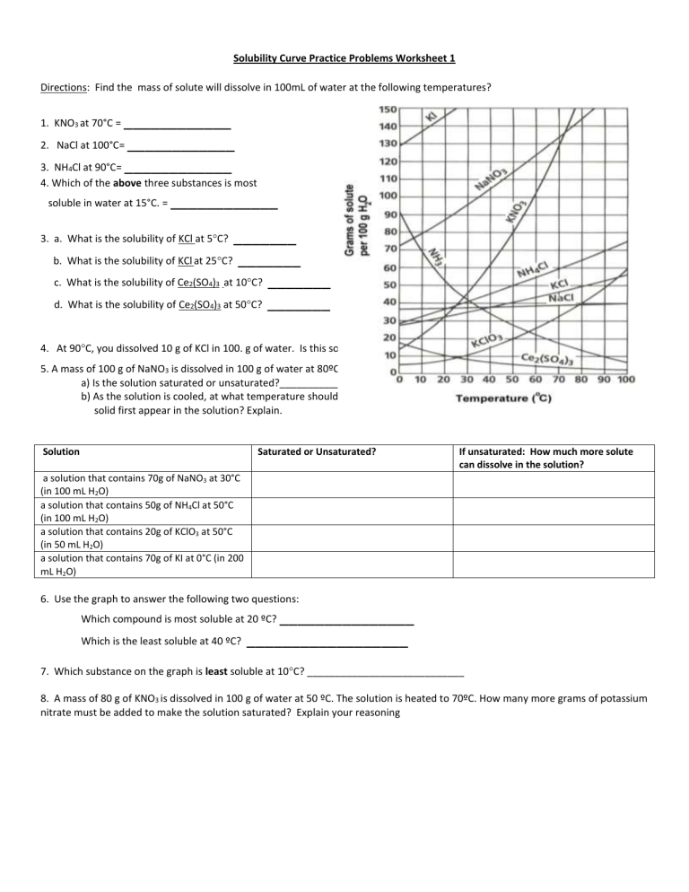 Furthermore, solubility curves worksheets often include questions that prompt students to think critically about the solubility of specific substances under different conditions. By answering these questions, students can demonstrate their understanding of solubility concepts and reinforce their learning through practice and repetition.