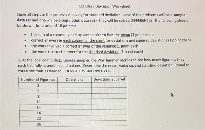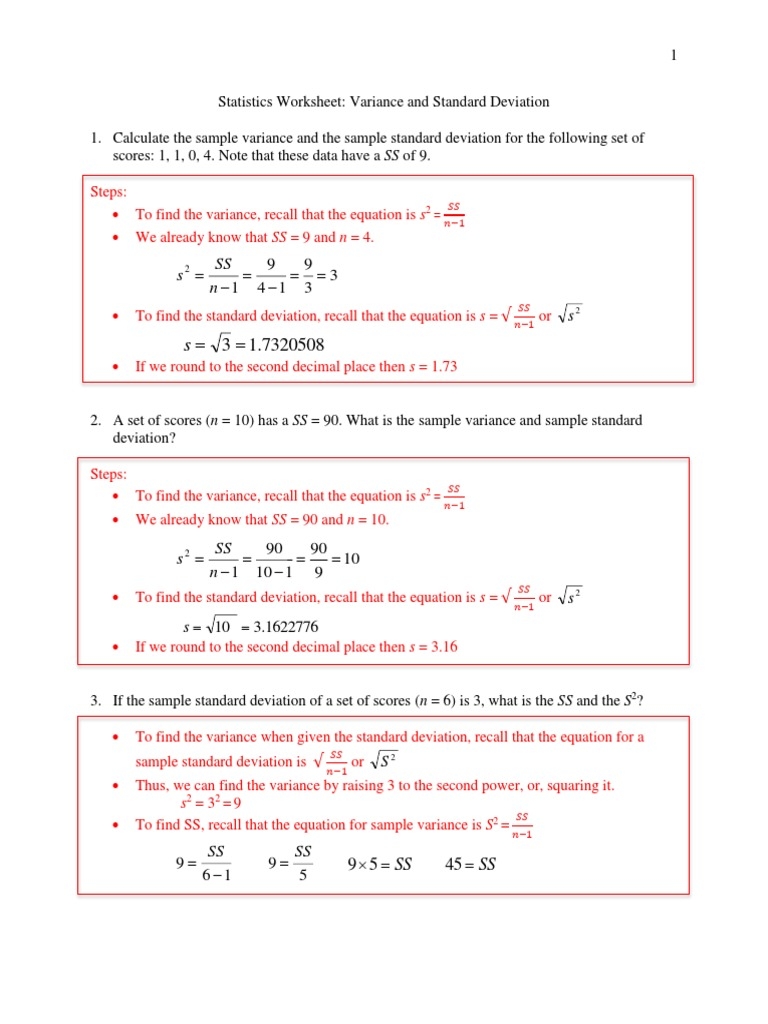 Standard deviation worksheets typically include a set of data points for students to work with. Students are required to calculate the mean of the data set, then find the differences between each data point and the mean. These differences are squared and then averaged to find the variance. The square root of the variance is then calculated to determine the standard deviation.