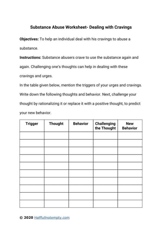Substance abuse is a serious issue that affects millions of people worldwide. It can have devastating effects on individuals, families, and communities. One of the ways to address substance abuse is through the use of worksheets. These worksheets are designed to help individuals identify their triggers, thoughts, and behaviors related to substance abuse, and develop coping strategies to overcome it.