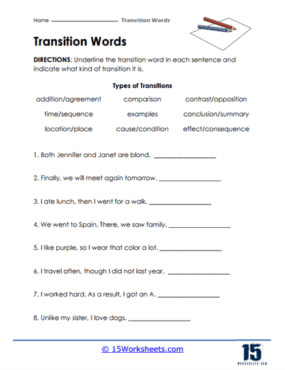 One way to practice using transition words is through worksheets. These worksheets typically contain exercises that require students to identify and use different transition words in sentences or paragraphs. By completing these worksheets, students can improve their understanding of how transition words work and how to use them effectively in their own writing.