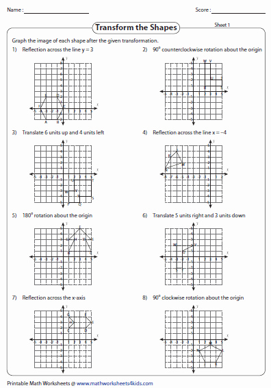 Reflection problems on these worksheets involve flipping a shape over a line. Students might be asked to reflect a shape over the x-axis or y-axis, or even over a diagonal line. By completing these problems, students can see how reflection changes the orientation of a shape while preserving its size and shape. These exercises help students develop spatial reasoning skills and an understanding of symmetry.