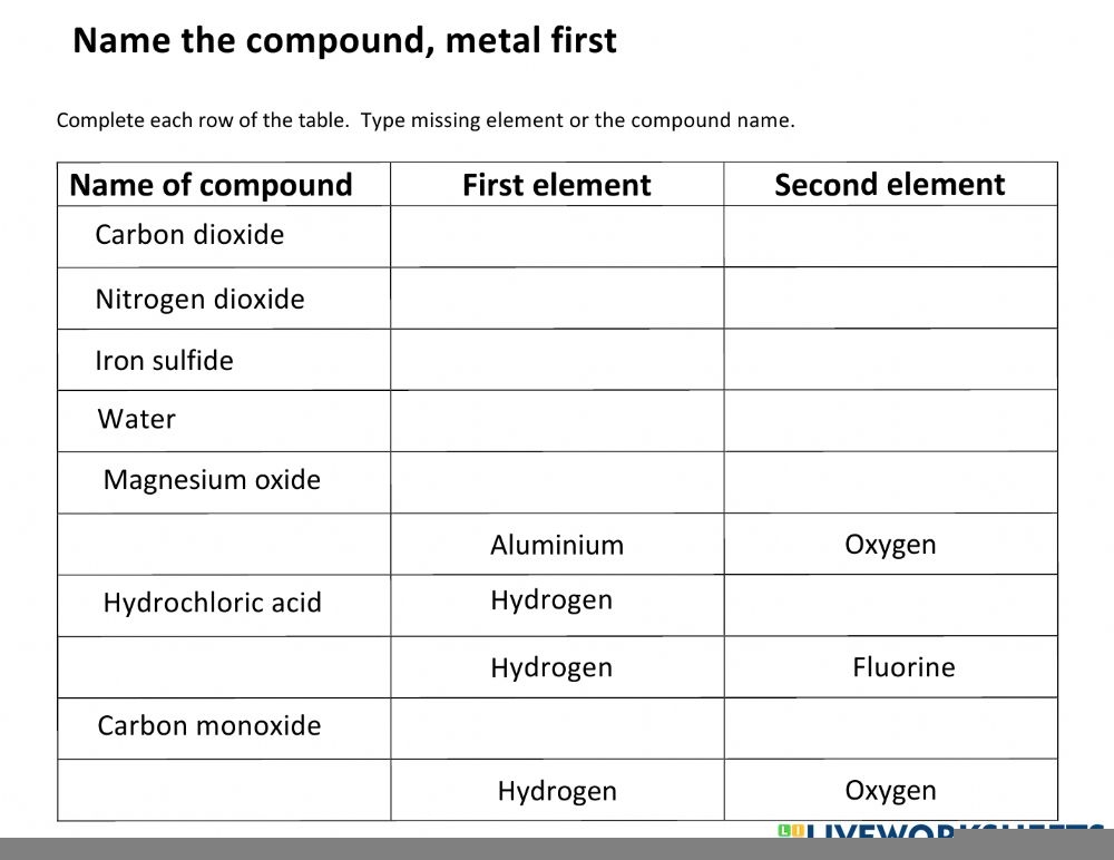 Worksheets on naming compounds typically include a variety of chemical formulas that students must name correctly. These worksheets can cover different types of compounds, such as ionic compounds, covalent compounds, acids, and bases. By completing these worksheets, students can improve their ability to recognize the naming conventions for each type of compound.
